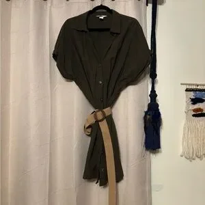 Stylish olive green button-up dress. Features a tan belt for a flattering fit.
