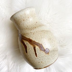 The vase is a hand-thrown ceramic vessel with a bulbous body and a narrow neck. It features a speckled, off-white or beige glaze on the upper three-quarters, with an organic, dark brown glaze design that appears to drip down the side.