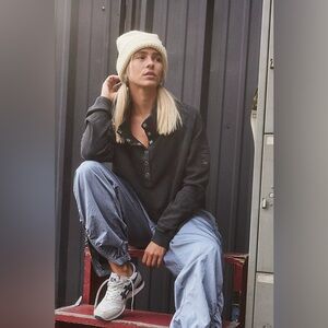 So cozy and effortlessly chic, this top features a soft fabrication with relaxed silhouette and loose pleating, with ribbed detailing and snap buttons.