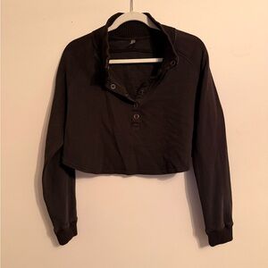 Features: Soft fabrication; relaxed silhouette; ribbed fabric and ribbed detailing at cuffs; snap closures at neck
