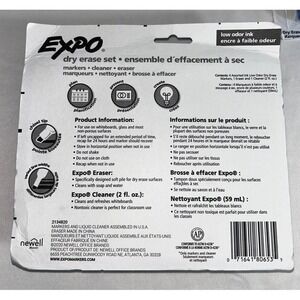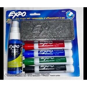 Features: Expo whiteboard cleaner, Dry erase markers in red blue green black, Eraser, Chisel tip markers