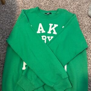 Add a pop of color to your wardrobe with this eye-catching green crewneck sweater. Featuring bold text, it's perfect for a casual, stylish look.