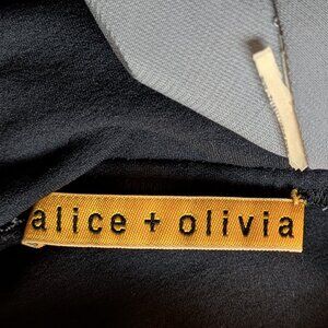 This is an Alice & Olivia dress with a black upper body and leopard print skirt. It is in excellent condition, but the care tag and size tag have been removed. It is an estimated size small, and the last two images show measurements. Pullover style. Stretchy double layer black tube top made of 92% nylon and 8% spandex that you can fold over to shorten the length if you wish. A-line skirt with the outer leopard print shell made of 68% cotton and 32% silk, and fully lined with 97% polyester and 3% spandex fabric.