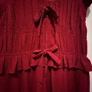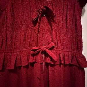 Chic red dress featuring short sleeves and bow accents. Perfect for any occasion.