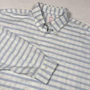 Details: Button-down collar, full button front placket, embroidered Brooks Brothers Golden Fleece logo on left chest, long sleeves with barrel cuffs and multiple buttons, back box pleat, curved shirttail hem, collared neckline.
