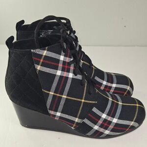 Comfort Collection Women's Black Plaid Wedge Ankle Boots Lace Up Side Zip Size 8