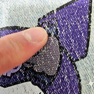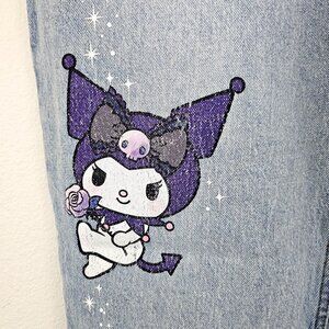 Mom Jeans-type fit with a high rise. Print of Kuromi on one leg, purple butterflies fluttering on both legs and Her name is also printed on the back pocket.