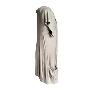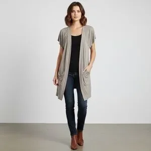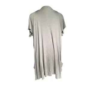 This Anthropologie cardigan in a soft tan hue features a flowing draped front and short sleeves with gentle gathering at the shoulders. Its open-front design and lightweight material make it ideal for layering, adding a touch of elegance to any outfit.
