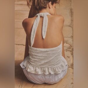 Halter neck top with tie and V-neck. Elasticated honeycomb-texture fabric on the front. Hem finished with frills.
