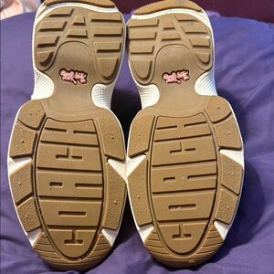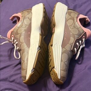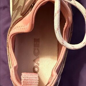 Stylish Coach sneakers with a brown monogram design. Pink accents add a pop of color. Comfortable and trendy.