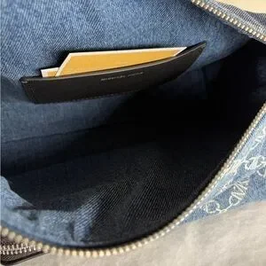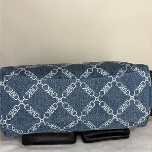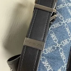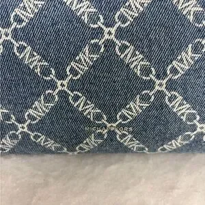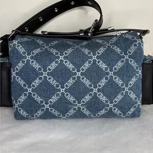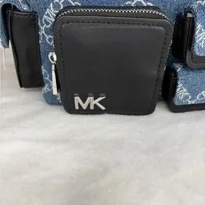 Michael Kors Dakota medium Pocket shoulder bag, handbag, cargo bag, NWT in union wash denim, silver hardware, zip top, adjustable shoulder strap, 5 outside pockets, 1 inside slip pocket, denim with MK design, black leather trim