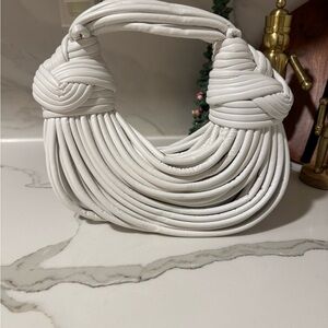 Modern white padded shoulder bag with a striking sculptural design and oversized knotted handle details. Features layered, cushioned construction that gives this bag a bold yet minimalist look inspired by contemporary designer styles.