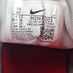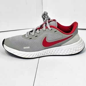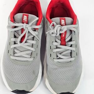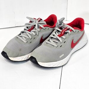 Stylish gray and red running shoes with a bold design. Perfect for athletic activities.