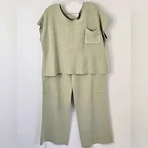 Sincerely Jules 2-Piece Knit Pants Set in Soft Sage Green Color. Crew Neck Sleeveless Ribbed Knit Top with One Breast Pocket. Wide Leg Elastic Waist Pull-on Knit Pants with Cargo Style Pockets. Perfect for Transitional Weather. Gorgeous!