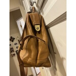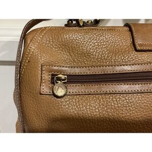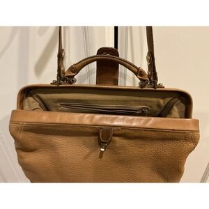 An authentic vintage doctor bag, presenting a timeless silhouette for the discerning collector. This satchel-style handbag features a rich tan leather exterior with a distinctive pebbled texture, complemented by a structured top handle and an optional, adjustable crossbody strap for versatile carrying options. The bag is secured with a top clasp closure, opens to a spacious interior complete with a zippered pocket. There is a patch pocket on the exterior back of the bag with zipper closure.