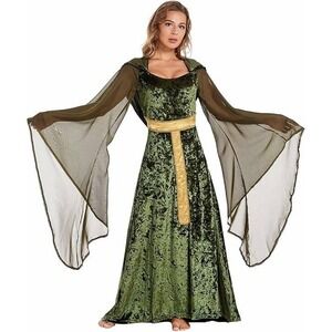 Green crushed velvet medieval fantasy costume dress with flowing sheer sleeves and a fitted bodice featuring a decorative gold trim. The back of the dress has a corset-style lace-up closure for adjustable fit. A coordinating hood is attached for a dramatic effect.