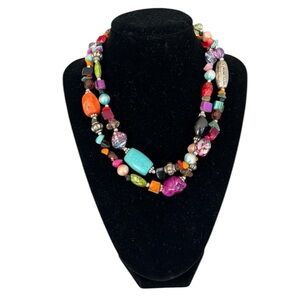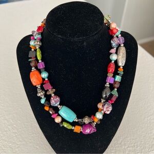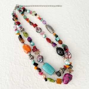 Vibrant multicolor beaded necklace featuring a mix of faux turquoise, orange, amber, green, pink, purple and silver tone beads. Perfect for adding a pop of color to any outfit.