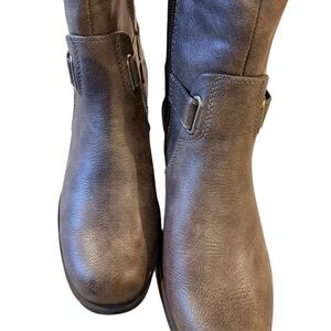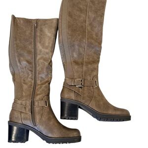 Low block heeled boots, knee high, riding boots. Faux Leather with fabulously soft shearling lining. Features a stylish buckle and side zipper. Ideal for any outfit.