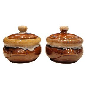 Vintage Brown Glazed Ceramic Soup Bowls With Lids - Handcrafted Drip Design