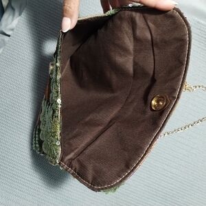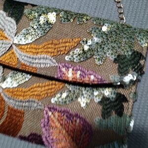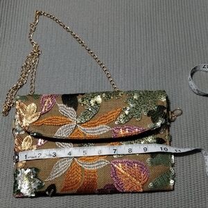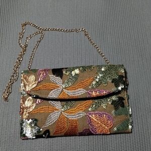 Chic clutch with vibrant floral sequins. Features a stylish chain strap. Ideal for evening wear.