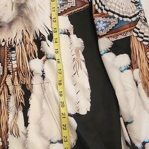 Keywords: graphic hoodie, wolf print, feather detail, dreamcatcher, tribal print, streetwear, casual wear, outerwear, winter fashion, unique design, bold print, statement piece