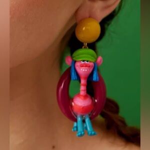 Playful earrings featuring a troll doll design. Bright pink, yellow, and green colors.