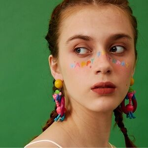 Add a playful touch to your outfit with these vibrant earrings. Featuring a mix of pink, yellow, and green, they are perfect for making a statement.