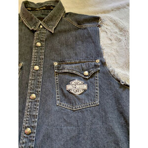 Harley Davidson Sleeveless Distressed Denim Button Shirt Vest Men's Size Large in good condition.