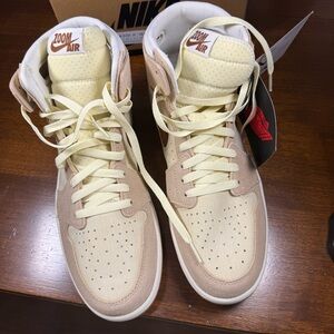 Cream and tan sneakers with Nike swoosh. Features Zoom Air branding.