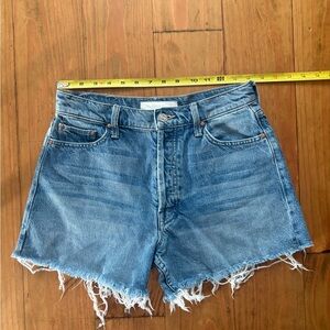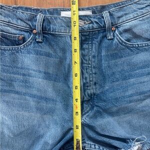 Mother Superior The Short N Long Fray" vintage-inspired, high-waisted denim shorts by the brand MOTHER, known for their raw, frayed hems and semi-rigid 100% cotton denim that breaks in with wear. “The Skipper," offer a longer, more modest cut than typical cut-offs with a ~4-inch inseam, designed for a comfortable, casual fit with a button fly and classic five-pocket design.