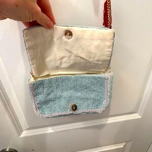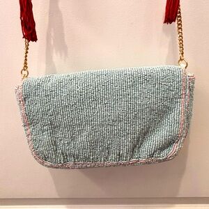 The tomato beaded shoulder baguette is a delightful and feminine bag, featuring a charming summer tomato pattern made from carefully arranged beads. Its slim, baguette silhouette adds a touch of elegance, while the cheerful red tomato design brings a fresh, playful vibe. With a convenient gold chain and red tasseled strap, this bag is just the right size for daily essentials, making it a stylish and eye-catching accessory for any casual or dressy occasion. Tomatoes adorn the light blue beaded front. Magnetic close.