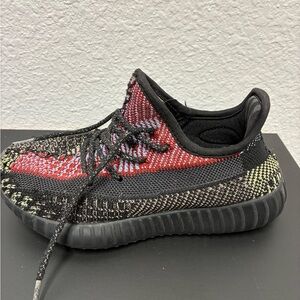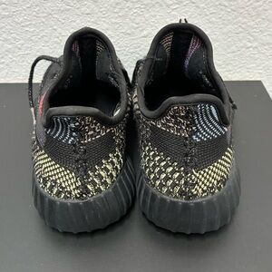 Stylish Yeezy sneakers for kids. Features a vibrant mix of black, red, and green. Comfortable and trendy design.