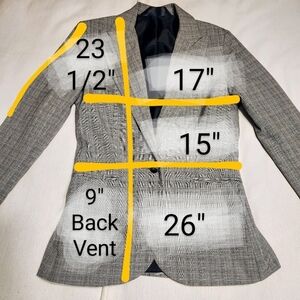 Classic long-sleeve career plaid jacket with two front welt pockets (still closed).