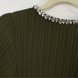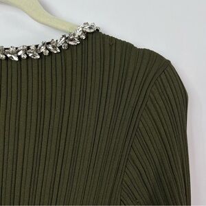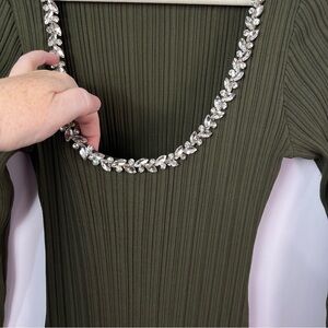 Bodycon style olive green color dress. Bell sleeves. Good used condition (appears to have never been worn) however two picked spots on back top area where jewels picked fabric.