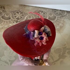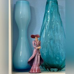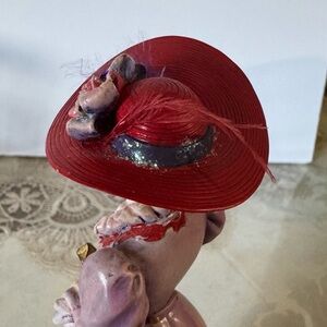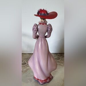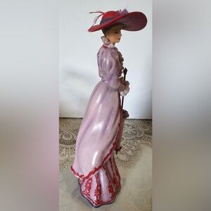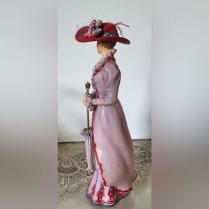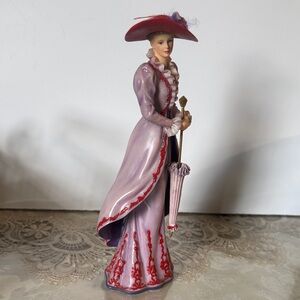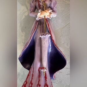This exquisite figurine features a lady in a flowing lavender dress with red accents, holding a matching umbrella. A perfect addition to your home decor, this piece adds a touch of elegance and charm.(As-Is)