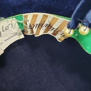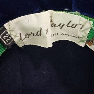 This vintage Lord & Taylor hat is a stunning addition to any special occasion outfit. The navy blue velvet velour material and tailored style give it a sophisticated look, while the equestrian style and duck bill add a touch of playful elegance. It is an original piece from the 1940s and is sized at 7 1/2. The hat is perfect for any vintage-loving woman who wants to stand out from the crowd.