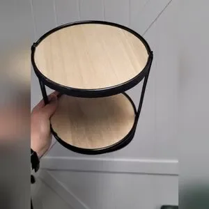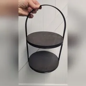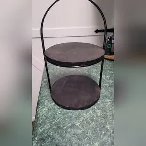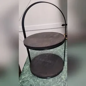 Chic black metal stand with two tiers. Ideal for showcasing items.