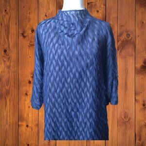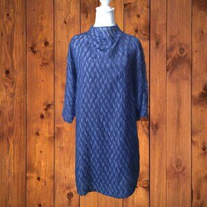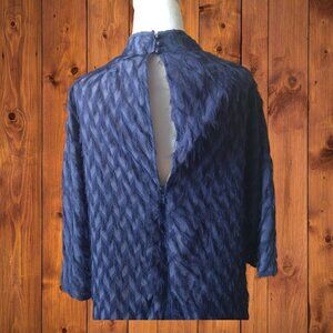 New with tags Anthropologie women's Large blue short sleeve dress has three button closure and neckline and keyhole back with back zip closure. It is lined, the sleeves are sheer. It has an argyle diamond pattern and mock neck front.