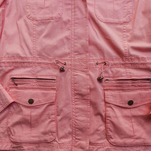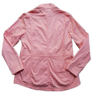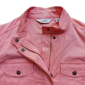 The LL Bean Peach Freeport Field Utility zip snap jacket in size small is a mid-length, long-sleeve jacket made from a comfortable cotton blend outer shell material. It features a zip closure with a classic fit suitable for everyday wear. The jacket is easy to care for with machine-washable fabric.