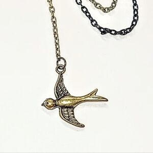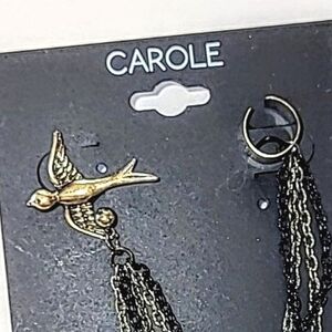 Bronze colored dove single pierced earring paired with a ball post earring that has chain loops in bronzy gold & black enamel attached to an ear cuff.