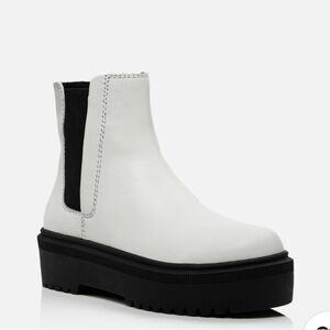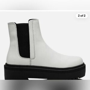 Elegant white leather boots featuring black elastic sides. Ideal for versatile styling. Sold at bloomingdales, currently out of stock, $120 to 140