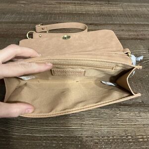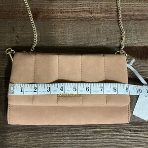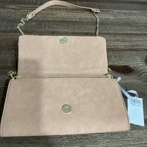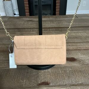 Stylish tan crossbody bag with gold chain accents. Perfect for any occasion.