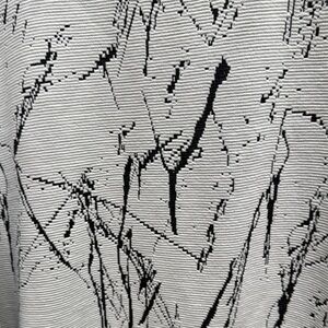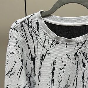 Stylish crew neck sweater. Black abstract pattern on white fabric. Comfortable and trendy.