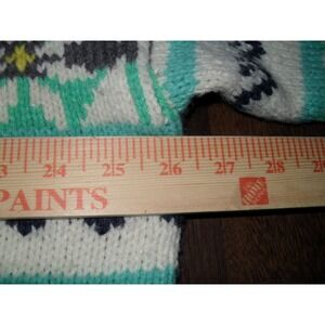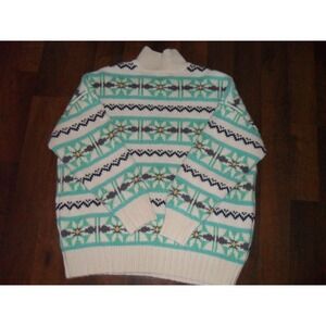 Cozy knit sweater featuring a unique Fair Isle pattern. This eye-catching piece boasts a comfortable mock neck and a classic pullover style, perfect for adding a touch of vintage charm to your wardrobe. The geometric design incorporates a blend of colors, creating a visually appealing and versatile garment.