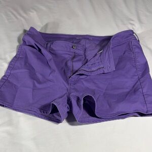Great condition, 65% cotton 33% polyester 2% spandex, solid lavender purple color, WOW High-Rise Short, denim jean material, flat front, zipper fly, button closure, 3” inseam 12” rise 40” waist