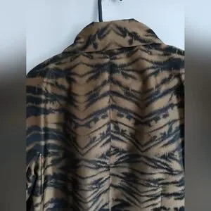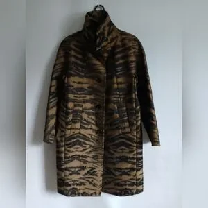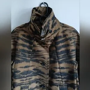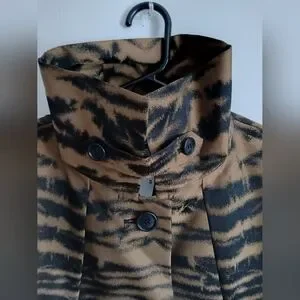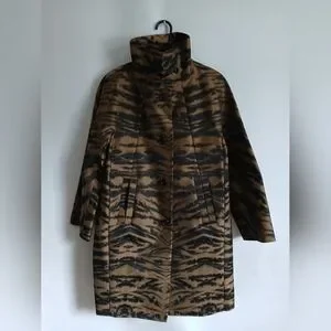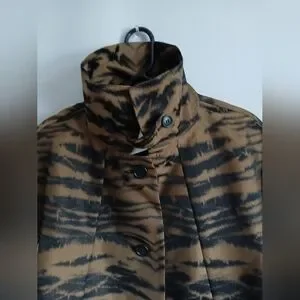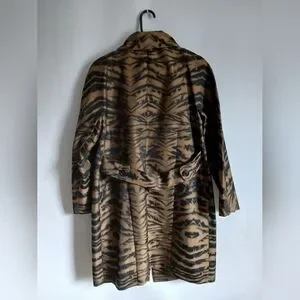 Modern, sophisticated versatile DKNY mid length lightweight coat with bold animal print. Features a classic collar and button front. New with tags. Measurements; pit to pit 20 inches, length 36 inches, sleeve length 24 inches.