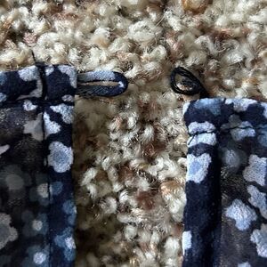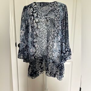 Michael Kors Women’s Blue Floral Sheer Blouse with Bell Sleeve. Lightweight. Size Medium. Missing button.