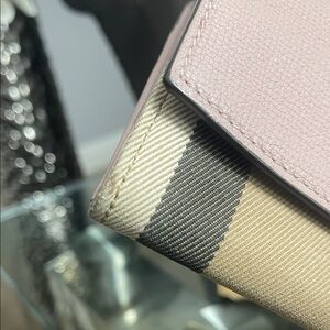 Elegant Burberry wallet. Features pink flap. Classic beige check pattern. Stylish and functional.