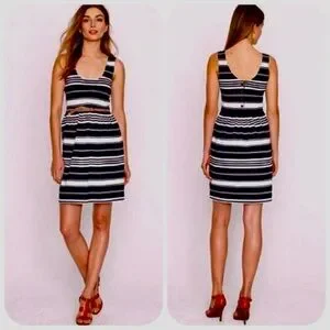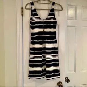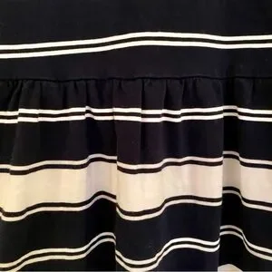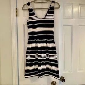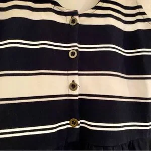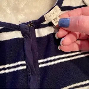 Elevate your casual style with this J.CREW dress in navy blue. The dress features a scoop neckline, sleeveless design, and a button-back closure. The striped pattern adds a touch of sophistication to the fit and flare, tank dress, and mini sundress style. Made of machine-washable cotton, this dress is perfect for casual occasions in the summer and spring seasons. The dress is available in size XS and is suitable for regular-sized women. The dress is not vintage and was manufactured in China.