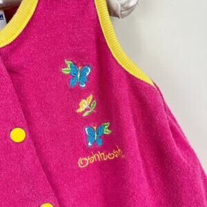 Vintage OshKosh B'gosh Pink Terry Butterfly Romper. Girls size 6. USA made. Sleeveless one piece shortall outfit. Perfect for every day play or using as a swim cover up at the beach! Pink with yellow trim and snaps and embroidered blue butterflies on the chest.